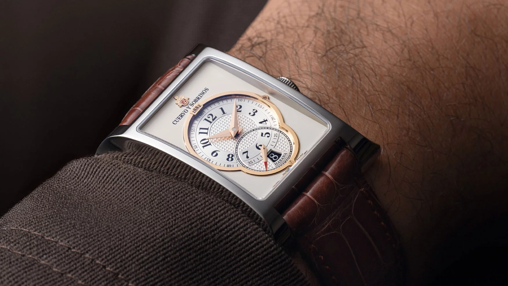 The top of the dial features the Cuervo Y Sobrinos text, and the red-accented applied logo to finish things off. It’s a classic-looking dial, which is exceptionally well-balanced and symmetrical. It makes use of the space well, and even with its circular inner dials, gives the watch the subtle look of watches like the Rolex Cellini Prince from the early 2000s, combined with Cuervo Y Sobrinos’ own historic watches from the 1930s. The lighter dial variation is limited to 82 pieces, as a homage to the brand’s founding year, 1882. (Also, a note for those unfamiliar with the brand: it was founded in Havana in 1882 but has since been revived in Switzerland.)